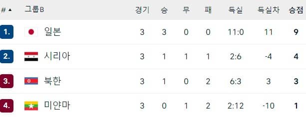 일본이 속한 B조는 3전 전승의 일본이 1위, 1승 1 무 1패의 시리아가 2위, 1승 2패의 북한이 3위, 미얀마가 1 무 2패로 4위입니다. 최근경기에서 북한이 일본에 0-1로 패했습니다.